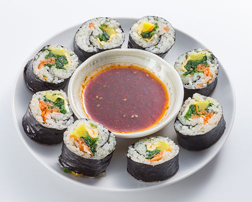 「まるふみ」のオープン当時からの人気商品です。ごま油で味付けしてある御飯に、ほうれん草・人参のナムル、タクアン、卵焼きを巻き込んであります。まったく辛くありませんのでお子様にも人気。豚足とともに予約注文もよくいただきます。(過去最高記録130本!!)焼肉店、居酒屋にもメニューにございます!